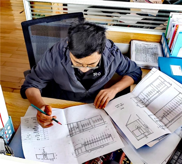 (刘剑华正在对剪叶机设计图纸进行修改 和镜芳摄)