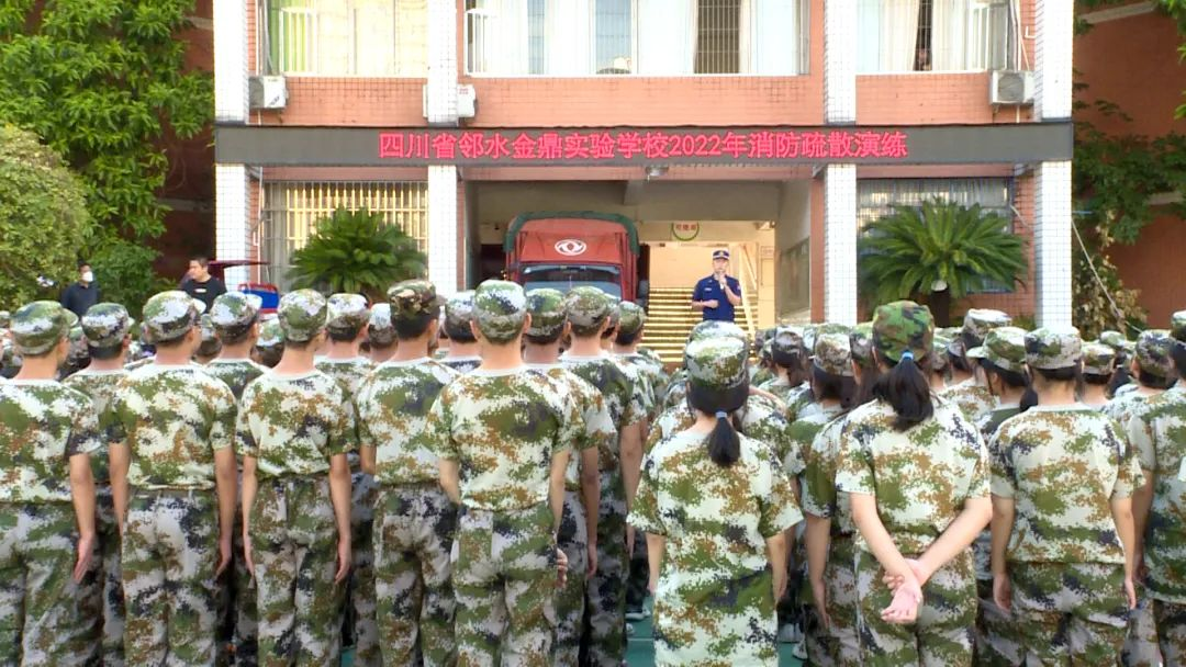 在邻水县金鼎实验学校,高一新生们正在进行消防应急演练。演练模拟火情发生,在寝室的学生们在教师和消防员的引导下,迅速疏散撤离到操场,短短两分钟,全体人员均安全逃离“火场”。随后,在操场进行了一场灭火器的实操练习,学生们亲自上手,亲身体验如何正确的使用灭火器进行灭火。