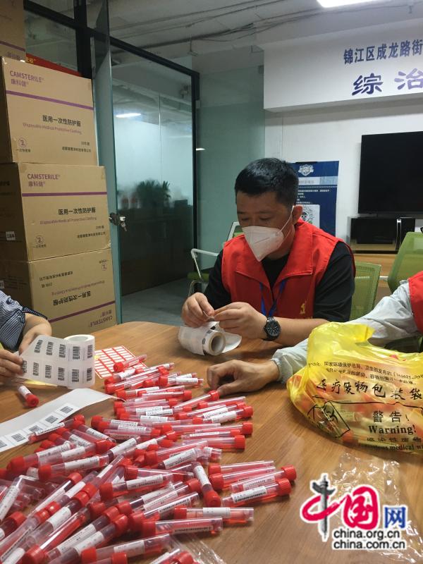 党员志愿者正在贴核酸试剂管的标签 (锦江区教育局供图)