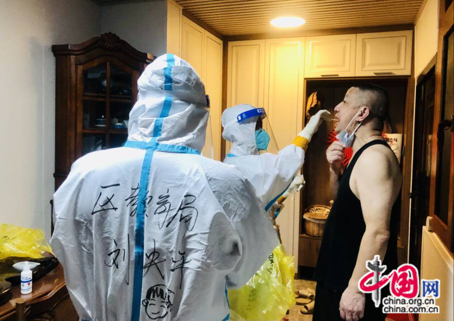 党员志愿者为隔离家中的黄码人员进行核酸检测工作 (锦江区教育局供图)