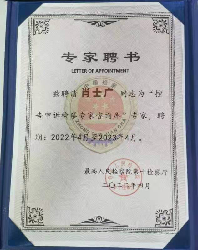 为此,最高人民检察院建立控告申诉检察专家咨询库,聘任92名专家参与涉法涉诉信访案件办理和矛盾纠纷化解工作,此次聘任的专家包括60名律师、21名心理咨询师和11名最高检退休干部。北京特派律师事务所主任肖士广律师作为其中最年轻的专家,受聘于最高人民检察院第十检察厅“控告申诉检察专家咨询库”,备受期待。