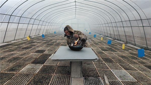(育苗业主吕志才在苗棚内增设火点 焦宏伟摄)