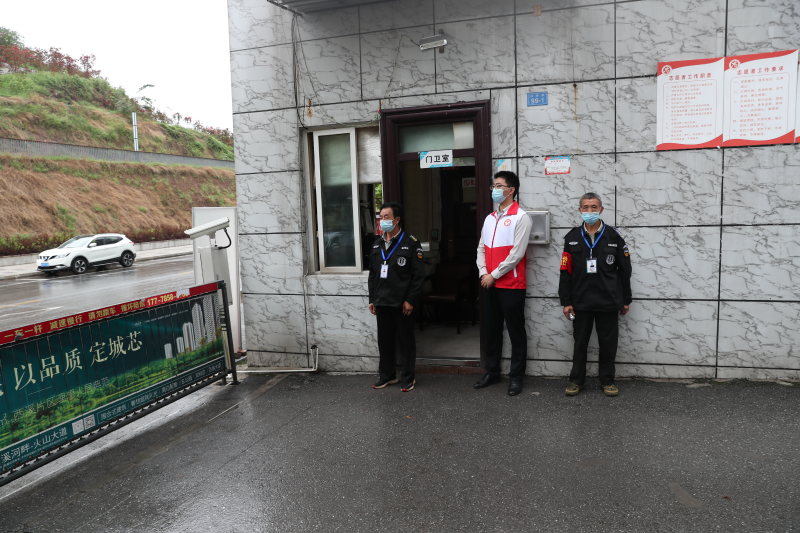 广安市政府党员志愿者邓云松(中)在广福街道大寨社区翠屏花园小区门口值守。