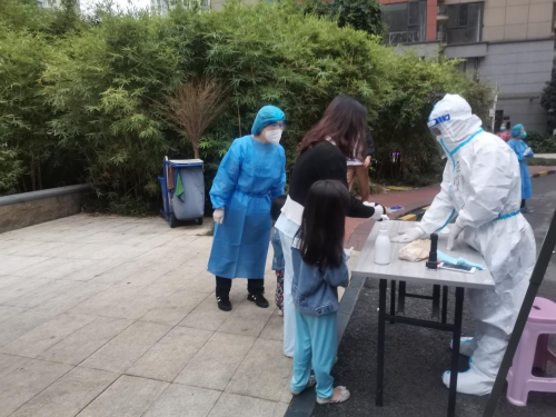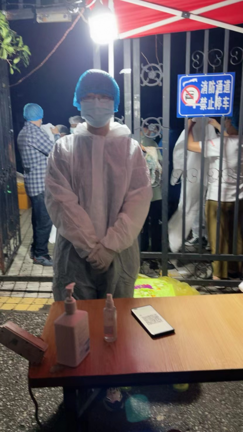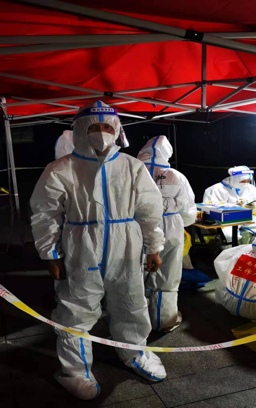 在国际城山水苑核酸检测点,面对突如其来的疫情,党员就是“战斗员”,作为一名老党员,郑娴同志积极响应号召,用实际行动践行初心使命。在参与抗疫过程中,大家都在争分夺秒与病毒“赛跑”。她放弃家里需要陪同上网课的女儿,毅然加入到社区抗疫大军中来。根据社区安排,她凌晨4点要起床洗漱,4点20分出门,4点30分与抗疫队伍集合,5点准时穿好“大白”开始挨家挨户通知。在“扫楼”过程中,为提高工作效率,志愿小分队的每个成员职责明确,其中,两人负责敲门通知居民下楼做核酸检测,而她则需要认真对房号、人数、居民健康码情况以及需要医护人员上门做核酸检测的家庭信息等同步做好登记,做到不漏一户、不漏一人,确保应检尽检。在结束一天的志愿服务,当脱下“战袍”的那一刻,看到大家汗湿的衣服,凌乱的头发,虽然稍显狼狈,可是大家却感受到自豪,脸上露出会心的微笑。