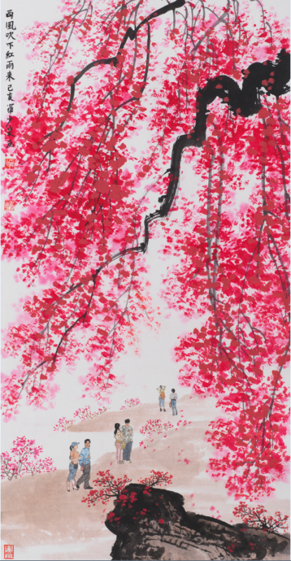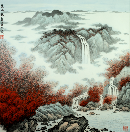 此外,罗建泉也是李可染的再传弟子,因此,他的画中,也有了一些北方的苍茫浑厚,使南方的秀丽山水,常有一股雄奇之气。他传承自李可染的“万山红遍”系列,气势磅礴,而又不乏空灵之气,可谓大师名作的传奇再现。