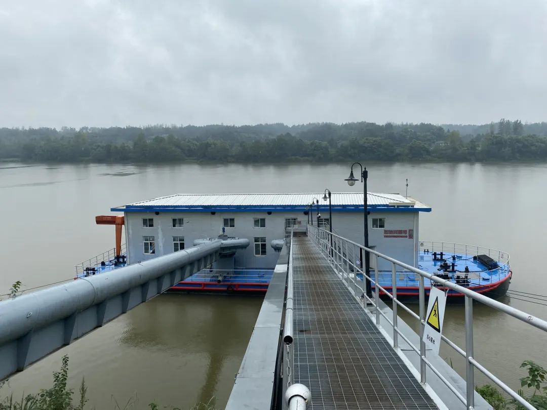 近日,天青色烟雨中,一条宽阔浩荡的嘉陵江,让四川省广安市岳池县镇裕镇大田湾村与武胜县烈面镇窑罐村隔江相望。在大田湾村一侧的嘉陵江边上,有一艘长40余米、宽10余米的白色浮船,通过两根百余米长的大型钢管与岸边相连,这便是岳池县嘉陵江水源供水工程的取水泵站。