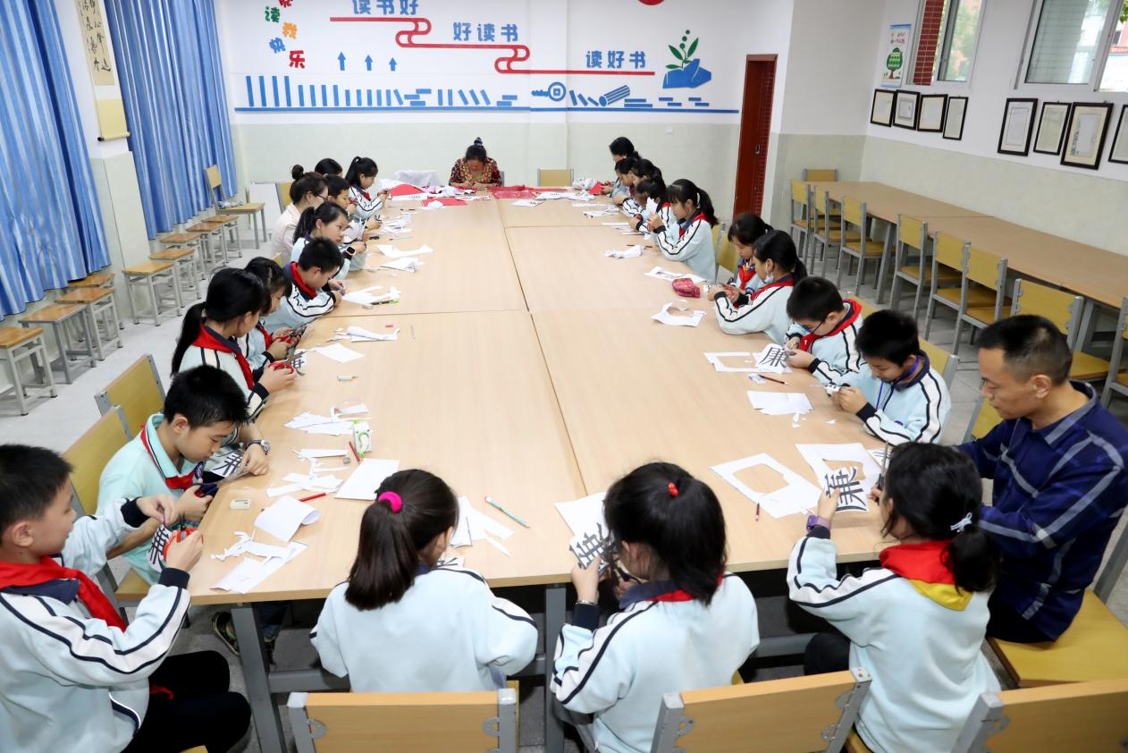 9月27日下午课后辅导时间,四川省广安市广安区长乐小学多功能工作室,该校美术兴趣组学生正在教师指导下剪“廉”字,传承非遗 “廉”润童心。