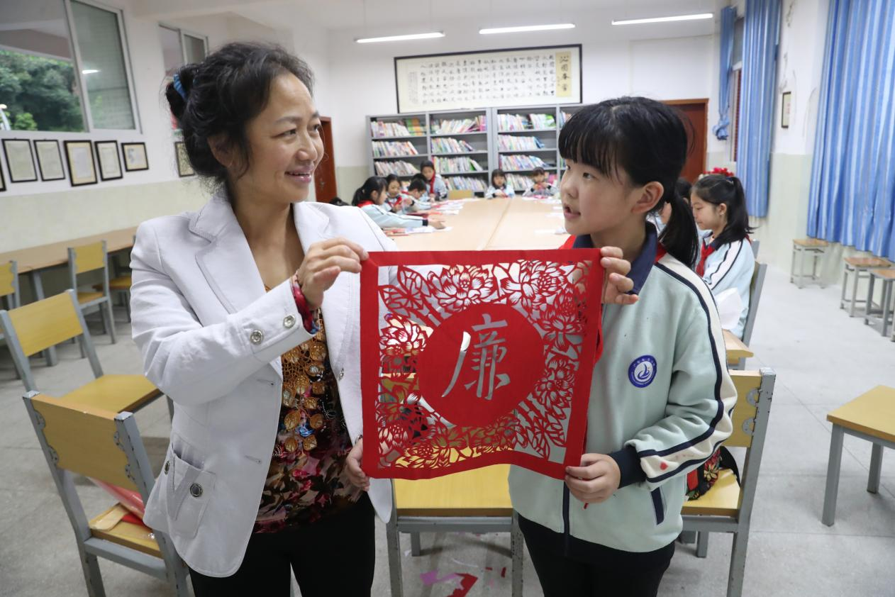 今年秋季开学以来,四川省广安市广安区长乐小学结合教育“双减”,传承非遗,采纳政协委员建议成立剪纸艺术兴趣小组,专门请来川东王氏剪纸传人、广安区政协诗书画院美术教师王明坤在下午课后辅导时间进行剪纸艺术传授。为倡导廉洁过国庆佳节,增强学生勤俭节约意识,9月27日下午王明坤应邀专门指导学生和部分党员教师剪“廉”字,并将自己的精心剪出的“廉”字窗花送给部分学生,让学生在潜移默化中受到廉洁教育。(廖小兵、李本军、卢淇/文图)