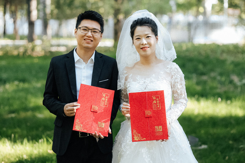 赵长禄和王云鹏为新人们颁发北航70周年校庆纪念版结婚证书。