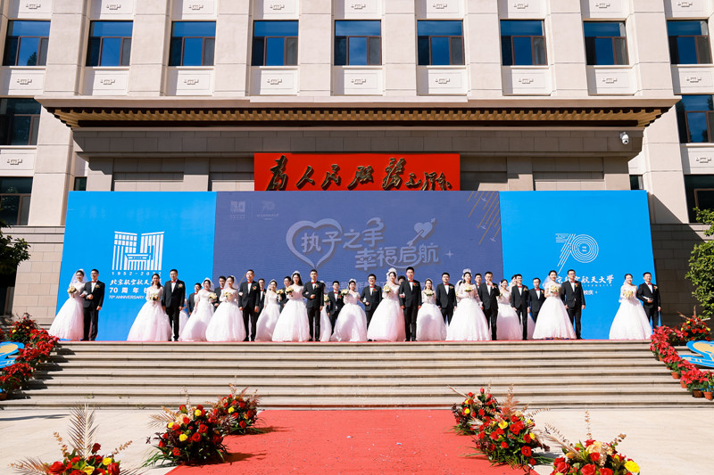 9月24日上午,在北航70周年校庆倒计时一个月之际,由校工会、教代会办公室和北航妇女联合会共同举办的“执子之手、幸福启航”青年教师集体婚礼在学院路校区举行,19对新人携手步入婚姻殿堂。