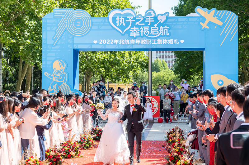 此次青年教职工集体婚礼是北航70周年校庆系列活动之一,旨在为新婚教职工送去美好祝福,引导他们树立正确的爱情观和婚姻观,积极承担家庭责任,重视家庭建设,展现了北航是一所浪漫、有爱、处处有温暖的大学,也将成为新人们人生中的一段幸福、特别、深刻的记忆。(北航供稿供图)