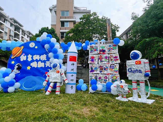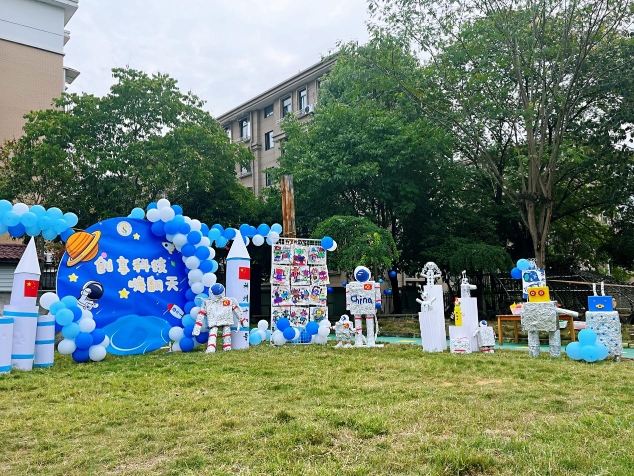 草坪上,“火箭”“飞机”“星际星球”仿佛进入战备状态,“宇航员”“机器人”全副武装,待命而发。这些琳琅满目的“高科技产品”,全都由孩子和老师们利用废旧物品改造而成。浓厚的科技氛围,让现场观摩的孩子们“哇”声一片。