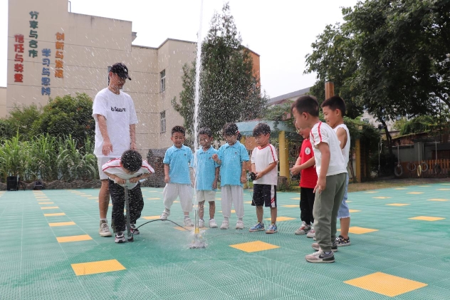 “水火箭发射”游戏现场,一群孩子正为火箭成功发射而欢呼雀跃。孩子们和老师一起利用废旧饮料瓶改造成火箭机身,连接自制气闸和打气筒,不断往饮料瓶内打气增压形成反作用力,最终在孩子们的倒计时中,灌满水的火箭在气压的作用下一飞冲天,燃爆全场,也点燃了孩子们心中的“航空梦”。