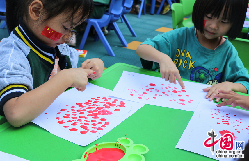操场上,在《我爱你中国》的歌声中,孩子们分年龄段,在老师的帮助下,用不同的“作画”方式表达对祖国的爱。小班的孩子们用稚嫩的小手掌和红色印泥“作画”;中班的孩子们用中国红颜料,加上象征爱的拇指,在“心”上,盖上满满的印章;大班的孩子们则用五彩斑斓的色彩,画出他们心中的祖国妈妈。