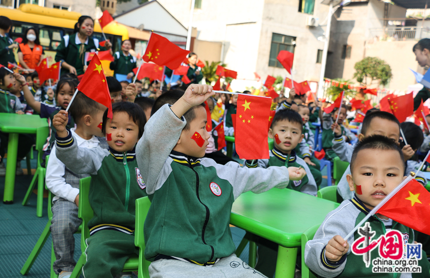 “压倒一切困难,战胜一切敌人......”9月30日,伴随着《中国人民解放军军歌阅兵曲》的响起,四川省泸州市古蔺县永乐街道永乐柏泺堡幼儿园的孩子们,以班级为单位,喊着响亮的口号,迈着整齐的步伐,走到操场上,升国旗、奏唱国歌。