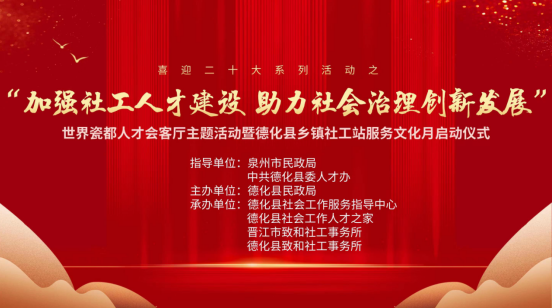 9月30日上午,由泉州市民政局、德化县委人才办指导,德化县民政局主办,德化县社会工作服务指导中心、德化县社会工作人才之家,致和社工事务所承办的喜迎二十大系列活动之——“加强社会工作人才建设 助力社会治理创新发展”世界瓷都人才会客厅主题活动暨德化县乡镇社工站服务文化月启动仪式在德化顺利举行。