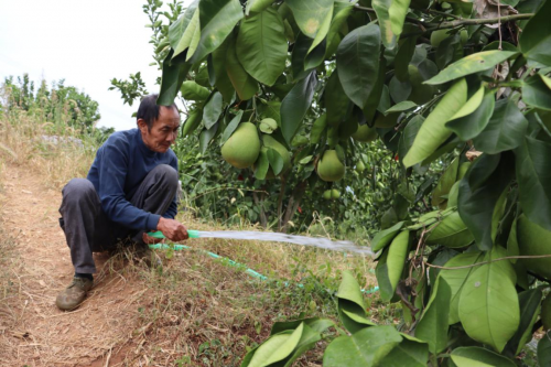 “在政府的帮助下,我们新接不同口径水管3000多米。利用这些灌溉设施,每3天对所有树分批次浇一轮水,从而保证了口感,也使产量影响尽可能减小。”下午两时多,与康佑农业合作社合作已有3年的村民叶长方,手持橡胶水管,正在为一棵棵树苗浇水,晒得黝黑的皮肤仿佛在无声诉说这个夏天的不易。浓密的树荫下,“靠山吃山”近五十年的叶老头,一边感慨“农业看天吃饭”的无奈,一边感谢党和政府的好政策及现代科技的助力。