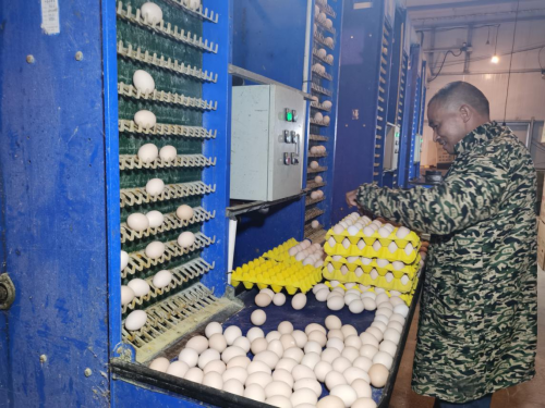 在江西省萍乡市上栗县杨岐乡关上村青山冲一处三面环山的山窝里,全自动化鸡舍、有机肥厂、仓库、饲料房有序排列,全自动鸡舍里,一排排白羽蛋鸡正在不停地啄食,全自动捡蛋系统循环运转,将一个个刚刚产下的新鲜鸡蛋运送至包装平台,工人们全神贯注地捡蛋、分级、装箱,每小时可包装鸡蛋16000余枚。