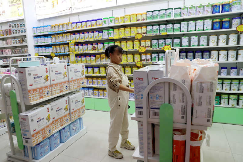 刘艳艳在广安区聪明谷孕婴生活馆摩尔春天店盘点奶粉等货品。廖小兵/摄
