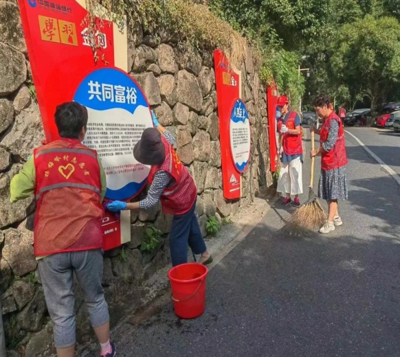 志愿者们身穿红马甲,齐心协力、分工合作,清扫沿路垃圾和卫生死角,擦拭路边宣传栏。