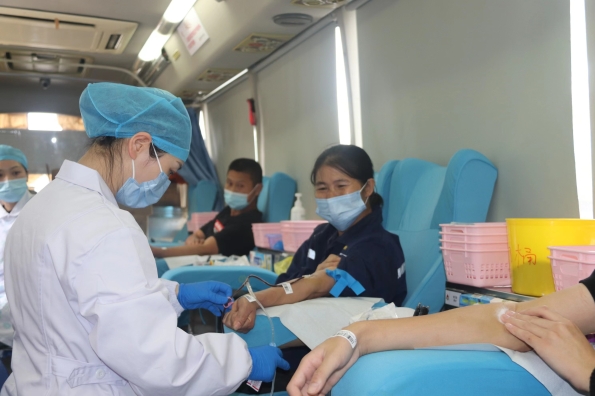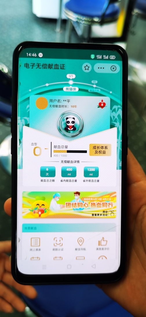 从广西南宁来钟管打工的丘女士,10年来第七次献血。她的电子无偿献血证和普通人不一样,她的身体里流动着的是O型被我们称为熊猫血的血液。“听到厂里有通知,今天政府内可以献血,我就来了,献血的时限差不多了,我本来就想找献血的地方!”风尘仆仆的她瘦瘦小小的,微笑的脸庞印在古铜色的肌肤上,显得亲切又健康。自从10年前,在电视机前看到很多人愿意奉献自己的血液救助他人时,邱女士就深受感染。虽然因身体瘦小曾被家人关切地阻止过,但是,自从知道自己的血液稀有,她便更加坚定地坚持献血。