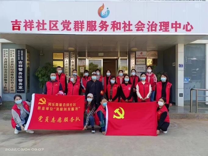 (陆良复烤厂党员志愿者与吉祥社区工作人员合影 庄美玲摄)