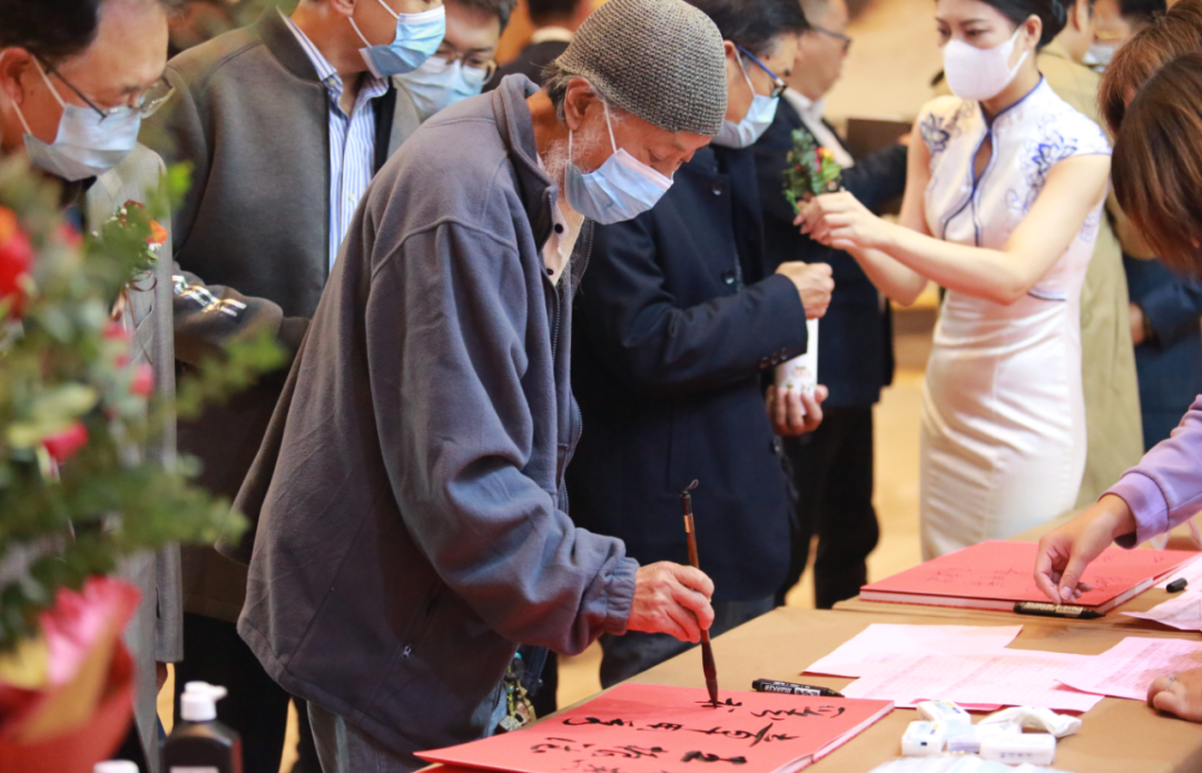 ▲书画家在签到处和创作区挥毫泼墨,以文会友,进行书法交流