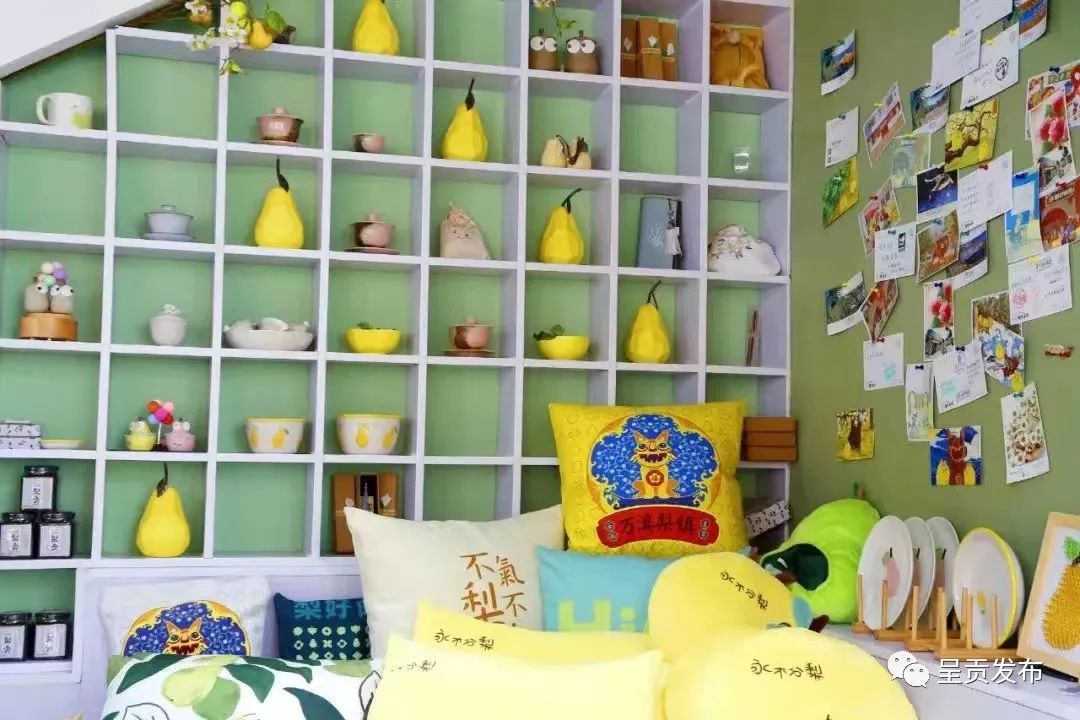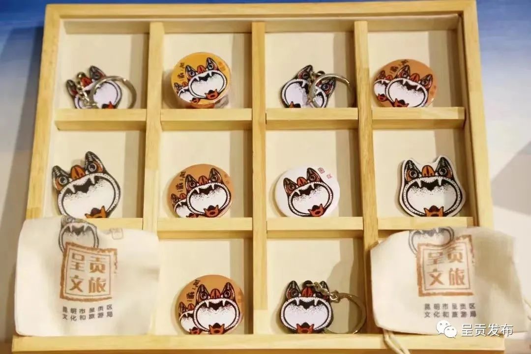 呈贡瓦猫跳下屋脊与时代相拥,经设计后以卡通形象被做成了胸针、抱枕、杯子、贴纸等文创产品,深受大众喜爱。不止瓦猫,呈贡区还结合菱角、剪纸、刺绣非遗,设计制作了冰箱贴、布袋、衣服、笔记本等共30余款非遗文创产品,成为了当今大众身边的装饰品、文具、办公用品等,它们走进了琳琅满目的超市商店,走进了文人墨客的书斋雅院,成为了男女老少青睐的装饰艺术品,重新“得宠”。