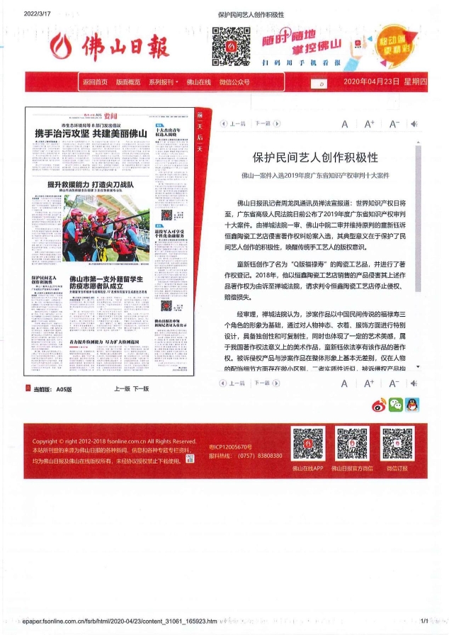 自成立以来,岭南公证处充分发挥公证职能,在协助广东本地企业保护商标、专利设计、外观设计和反不正当竞争方面成果颇丰,形成积极的社会影响力。如,2019年度广东省知识产权审判十大案件之一“童某钰诉广东某陶瓷工艺店侵害著作权纠纷案”,岭南公证处就出具的公证书成为原告童某钰起诉广东某陶瓷工艺店侵害其著作权的有力证据。