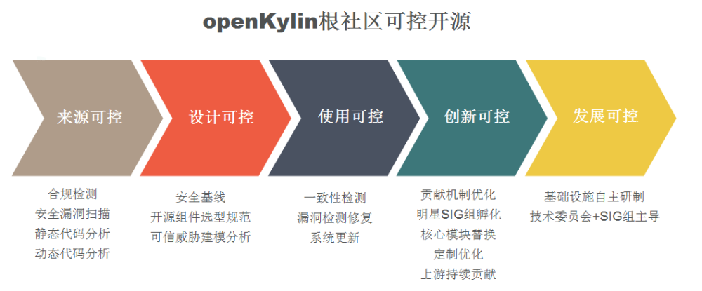“可控开源”是指在确保开源代码安全的基础上,使用户和开发者能够安全、持续、稳定的使用开源社区软件及开源软件涉及的支持性服务。该体系从代码的来源、设计、使用、创新和发展五个重要环节,围绕代码流通的全链路进行安全管理,从而大幅度提升桌面操作系统的安全能力。