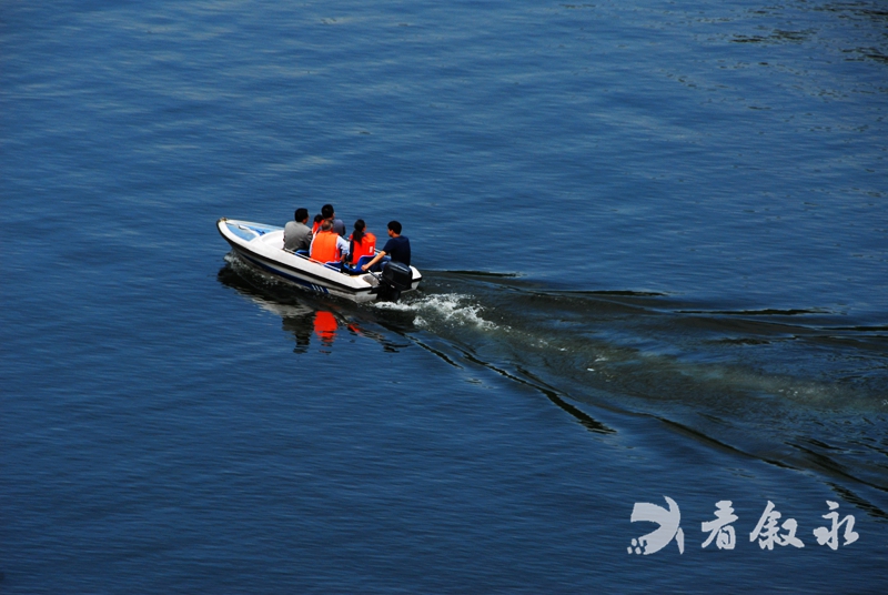 工作人员乘坐冲锋舟巡查水环境安全情况