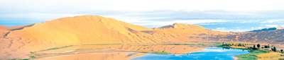 巴丹吉林沙漠面积约4.92万平方公里,拥有世界罕见且独特的沙漠与湖泊系统。必鲁图高大沙山及其周围的湖泊是这一系统的典型代表。该沙漠中分布有多座巨型沙山,还有140多个湖泊,最高大的必鲁图峰海拔约1611米,相对高差近500米,是世界上相对高度最高的沙山。巴丹吉林沙漠是研究青藏高原隆升过程中第四纪末期气候变化以及风力地貌、干旱区水资源的理想区域。图为必鲁图峰西北音德尔图湖及高大沙峰。杨 孝摄(人民视觉)
