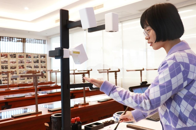 无论是云霞弄章的风情还是点墨幻云的意境,书法的魅力最初都是来自沁芳磨墨的漾漾清水和笔尖毫末的轻沾作抚。为保证学生的书写体验,华文众合将传统书法与现代科技相结合,古典智慧与当代思维相融合,文化情怀与教育理念相契合,自主研发交互式数字临摹台。“学生可以使用真实的笔墨纸进行学习,避免水写、电子模拟等书写体验对学生造成不良影响。”向大凤介绍,用笔生墨痕的原始触感能够引导学生探索传统书法之美。