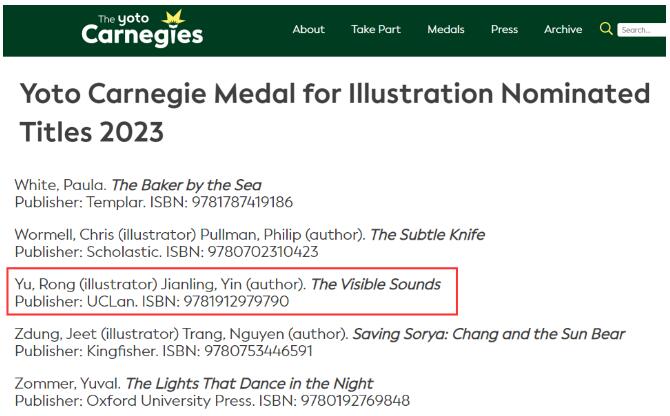 11月7日,2023年英国卡内基奖(Yoto Carnegie Medal)提名名单公布,华人插画家郁蓉凭借作品《寻找声音的女孩》入围卡内基奖插画奖,是该奖项自设立以来首位获得提名的华人插画家。