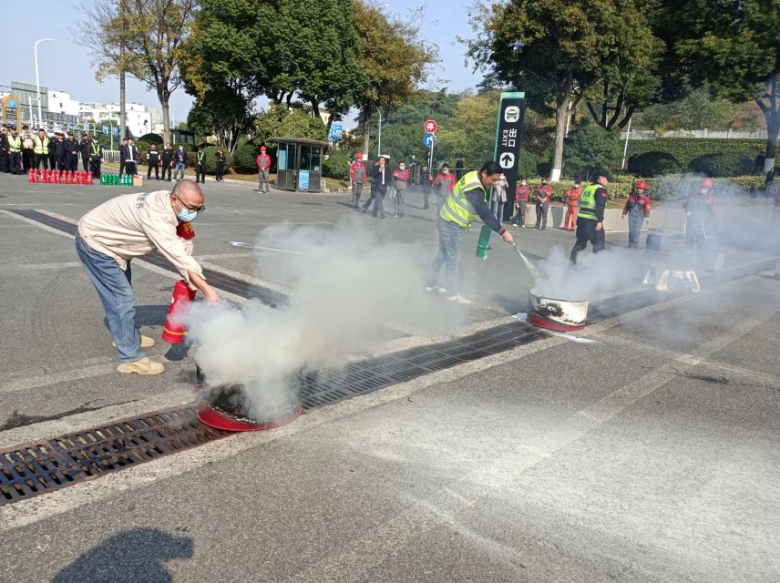 在应急疏散演练中,参演人员反应迅速、处置得当,安全有序疏散到指定地点;消防器材装备讲解教学与灭火实战环节,演练人员分三组手持灭火器与灭火毯迅速冲向着火的油盆,扑灭燃烧的火焰。消防体验将整个演练气氛推向高潮,现场观众学习并体验了穿防护服、铺设水带和消防出水的全过程,增加了活动的体验性和趣味性,激发大家认识消防、参与消防的热情。