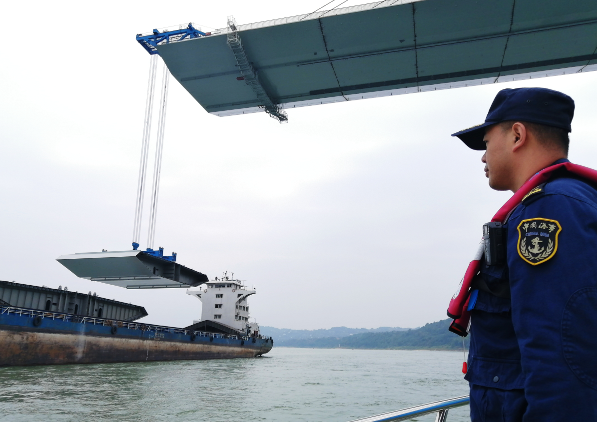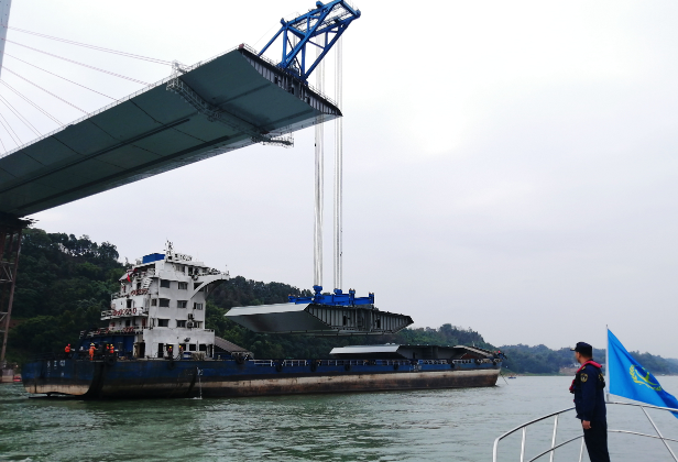 据了解,11月13日9时30分,泸州合江海事处执法人员乘艇到达现场,对泸州市白沙长江大桥吊装施工水域上下游船舶开展现场管控;10时,施工船舶在海巡12274的护航下,装载着本次吊装长15.5米,宽30.5米,搞3.5米,重量为245.6吨的钢箱梁驶向作业区,开始近4小时的吊装作业;13时40分,本次吊装作业顺利完成,负责施工水域现场管控的泸州海事海事处执法人员宣布禁航结束,恢复通航。