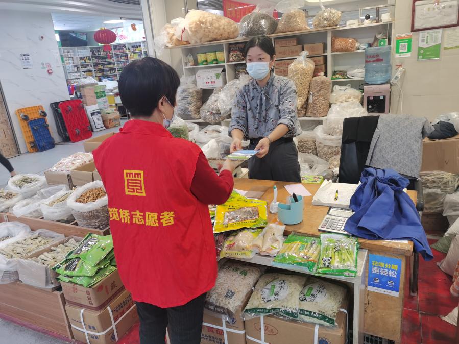 活动现场,志愿者队伍通过发放《浙江省生活垃圾管理条例》宣传册,讲述垃圾的危害,讲解垃圾分类类别、分类投放要求等相关规定,鼓励和引导大家从自身出发做好生活垃圾分类。同时,呼吁商户在经营过程中不主动免费提供塑料袋、有偿提供可降解塑料袋,引导居民在采买时自带纸袋或者环保购物袋,从实际行动践行绿色环保理念。