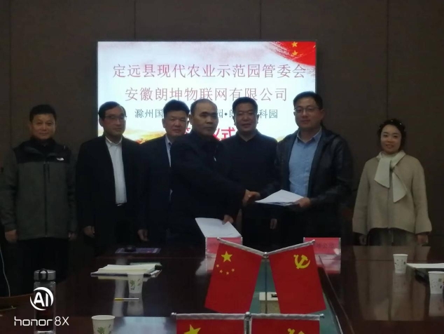 11月18日,定远县安徽滁州国家农业科技园•朗坤农科园项目签约仪式举行。该项目由安徽朗坤物联网有限公司投资建设,项目占地120亩,总投资6000万元。县党组成员、县现代农业示范园党工委书记柏传永、县审计局局长陈泽民、安徽朗坤物联网有限公司运营总监崔国斌、规划部部长张文婷以及县农业示范园管委会副主任王家东、西卅点镇镇长崔劲松等出席了签约仪式。