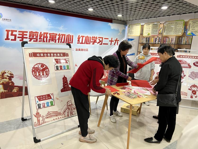 浴美施社区组织辖区居民组长开展垃圾分类剪纸宣传活动。社区垃圾分类专管员带领居民们在城市书房参观剪纸展览,然后再亲自动手学习。通过有趣的剪纸活动,居民更加体会到了垃圾分类与自己是紧密相连的,人人都要做好垃圾分类。
