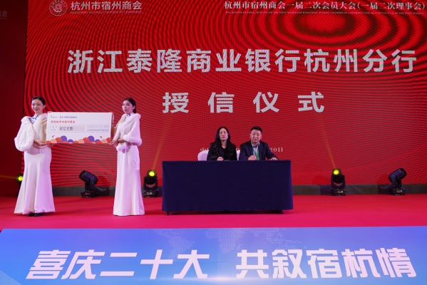 大会为执行会长单位、新会员单位举行了授牌仪式,并对商会抗击疫情爱心公益单位进行颁奖。会上,浙江泰隆商业银行杭州分行为杭州市宿州商会举行了2亿人民币授信仪式。