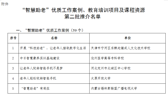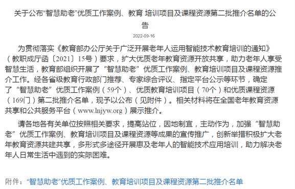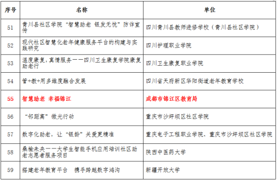 为贯彻落实《教育部办公厅关于广泛开展老年人运用智能技术教育培训的通知》(教职成厅函〔2021〕15号)要求,扩大优质老年教育资源开放共享,助力老年人享受智慧生活,教育部组织开展了“智慧助老”优质工作案例、教育培训项目及课程资源推介工作。经各省级教育行政部门推荐、专家综合评议、指定平台公示等环节,确定了“智慧助老”优质工作案例59个,锦江区《智慧助老 幸福锦江》工作案例成功入选。