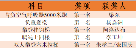 各参赛队伍中有六人荣膺背负空气呼吸器5000米跑、负重登楼、攀登挂钩梯、爬绳上四楼、双人攀登六米拉梯等科目第一名。迎宾大道特勤站、肖坝路消防救援站分获楼层火灾内攻操、枪炮协同灭火操和通信保障综合操竞赛冠军,充分展现了今年以来各单位练兵成果和新时代乐山消防指战员风采。