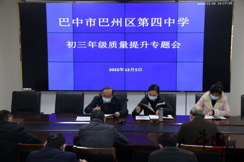 12月5日下午,巴中市巴州区第四中学召开了初三年级质量提升专题会议。校长吕安平,副校长张俊华,年级挂包领导、副书记赖平和教务处主任王锐、艺体处主任岳孟君、初三全体班主任老师和备课组长参加了会议。