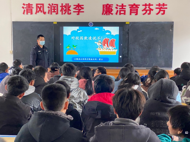 近日,湖北省江陵县沙岗镇初级中学联合沙岗镇派出所民警为全体师生开展“拒绝校园暴力,预防校园欺凌”的法制教育讲座。