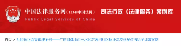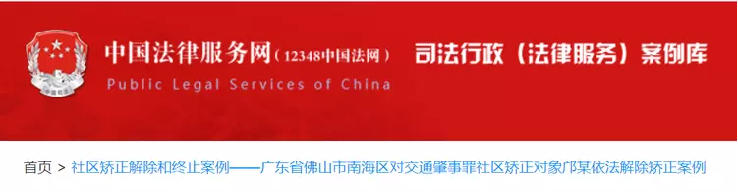日前,《广东省佛山市南海区对交通肇事罪社区矫正对象邝某依法解除矫正案例》《广东省佛山市三水区对缓刑社区矫正对象张某依法给予训诫案例》两个社区矫正案例,经过层层遴选,成功入选司法部中国法律服务网司法行政(社区矫正)案例库,并在中国法律服务网(12348中国法网)刊登。