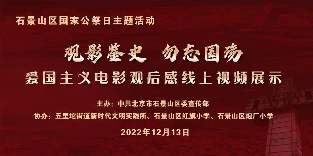 2022年12月13日是第9个国家公祭日,也是南京大屠杀惨案发生85周年纪念日。为缅怀南京大屠杀死难者和所有在日本帝国主义侵华战争期间惨遭日本侵略者杀戮的死难同胞,警醒和激励广大党员群众“勿忘国殇,捍卫和平,奋勇争先,砥砺奋进”,12月13日,中共北京市石景山区委宣传部利用公众号、抖音、快手、网易、今日头条、百度等网络媒体,广泛开展“观影鉴史勿忘国殇”——爱国主义电影观后感线上视频征集及展示活动,厚植广大党员群众和青少年学生深厚的爱国主义情怀,凝聚广大人民维护世界和平、实现中华民族伟大复兴而不懈奋斗的强大正能量。