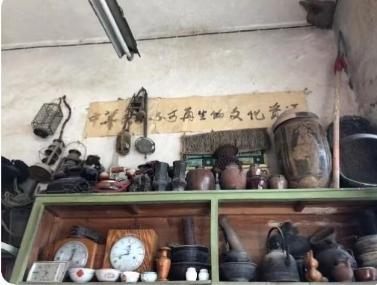 经营多年来,张鲁军除了给店里增加了一面置放“旧物件”陈列墙外,还一直保持着原来零售批发部的布局。仔细看,这面陈列墙上的“旧物件”还真不少,有陶泥坛子、青花瓷具、煤油灯、老式电话,还有很多“有年龄”的农耕器具。这些东西都是张鲁军的“心头宝”,也是他店里的“引流”密码之一。