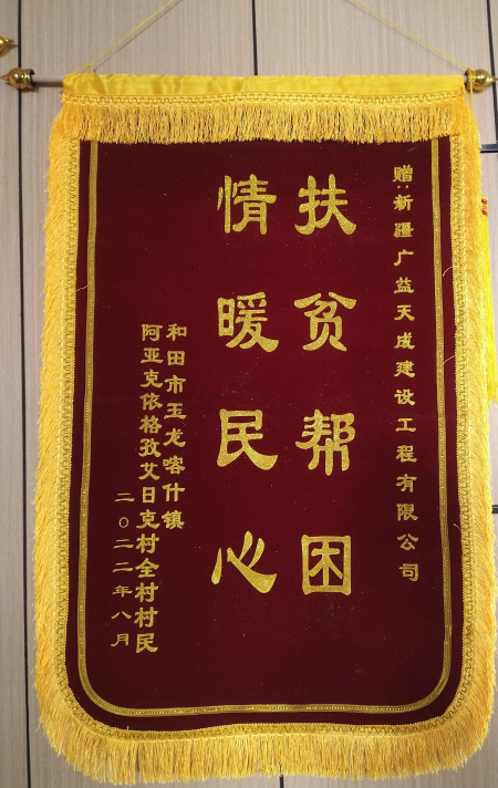 2022年,感恩于广益天成为和田市玉龙喀什镇阿亚克依格孜艾日克村村委会推动乡村振兴工作做出的贡献,该村全体村民赠送“扶贫帮困,情暖民心”的锦旗。