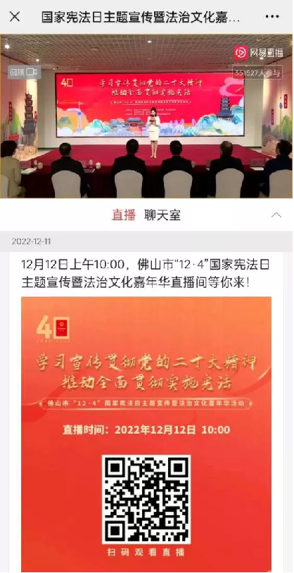今年的12月4日是我国第九个国家宪法日,也是我国现行宪法公布施行40周年,为大力弘扬宪法精神,加强宪法学习宣传,推动全面贯彻实施宪法,12月12日上午10时,佛山市2022年“12·4”国家宪法日主题宣传暨法治文化嘉年华线上直播活动如期举行。此次活动由佛山市人大常委会办公室、市普法办、市司法局联合禅城区普法办、禅城区司法局主办。