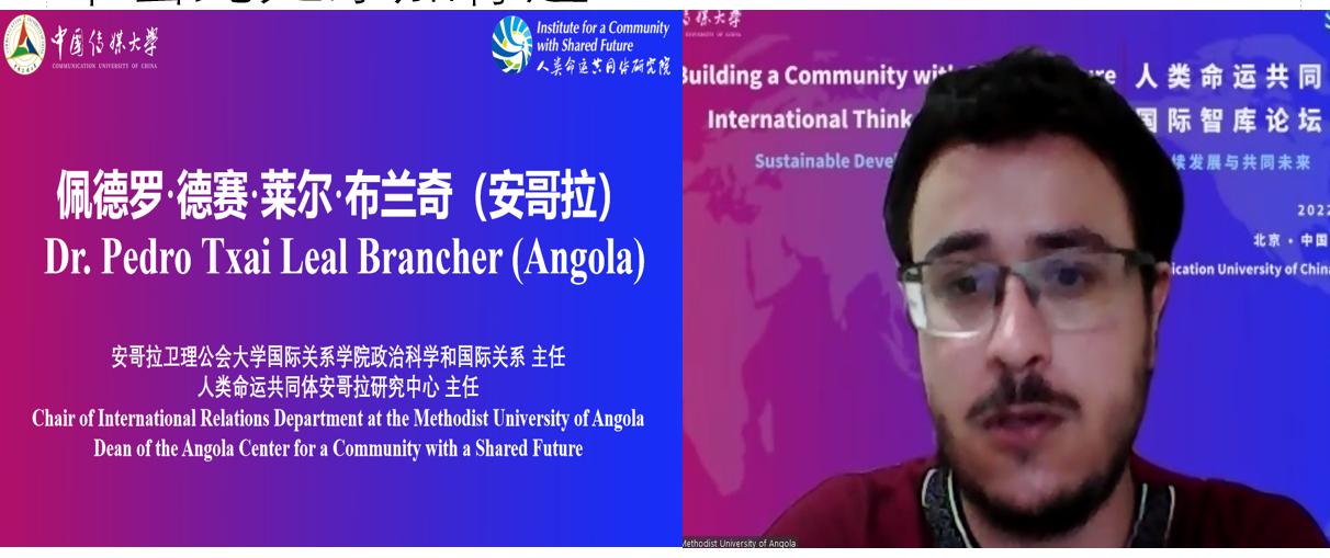 安哥拉卫理公会大学国际关系学院政治科学和国际关系主任、人类命运共同体安哥拉研究中心主任佩德罗·德赛·莱尔·布兰奇博士的演讲题目为《全球性问题的全球性解决方案:新时代的可持续发展与人类命运共同体》。布兰奇博士从南方国家的角度出发,深入探讨了可持续发展与共同未来的重要性。他认为,人类命运共同体理念在开创新型国际关系中起到重要作用,为推动构建团结、多元的世界大环境开启了新思路,为全人类共同应对气候变化、贫困和不平等问题,迈向可持续发展的未来创造了良好的发展环境。